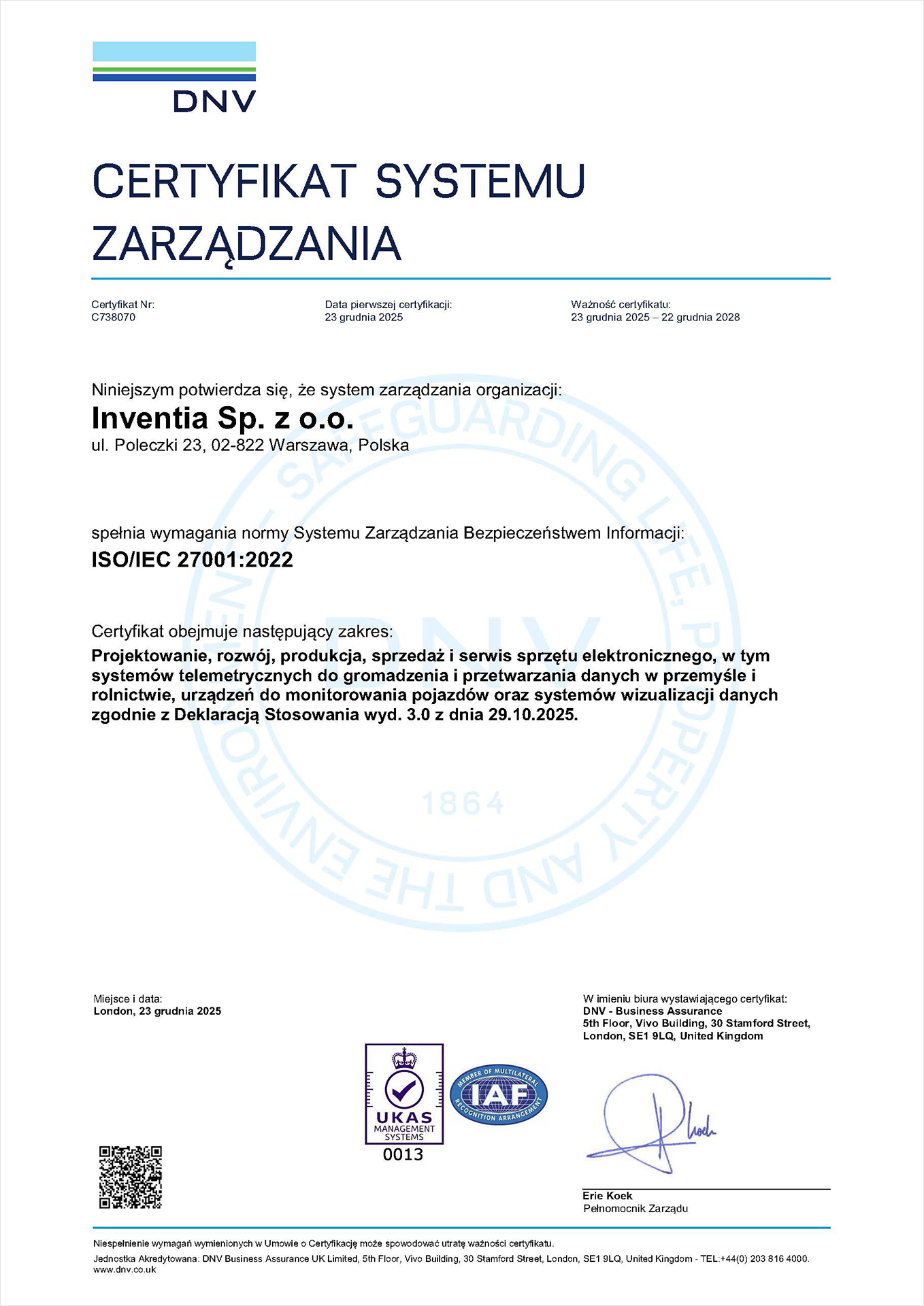 Misją Inventii jest dostarczanie elastycznych, innowacyjnych i bezpiecznych rozwiązań telemetrycznych oraz IoT. Certyfikat ISO/IEC 27001 potwierdza, że bezpieczeństwo informacji, jakość i odpowiedzialność są dla nas równie ważne jak technologia.