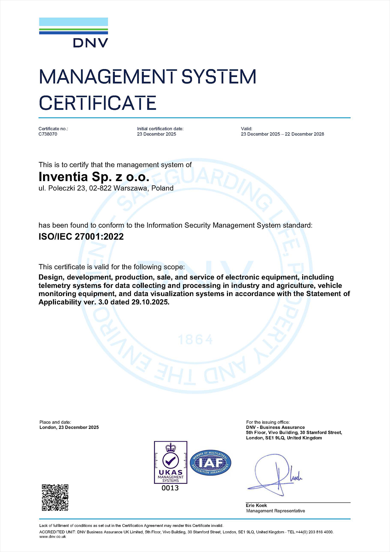 La misión de Inventia es proporcionar soluciones telemétricas y de IoT flexibles, innovadoras y seguras. La certificación ISO/IEC 27001 confirma que la seguridad de la información, la calidad y la responsabilidad son tan importantes para nosotros como la tecnología.