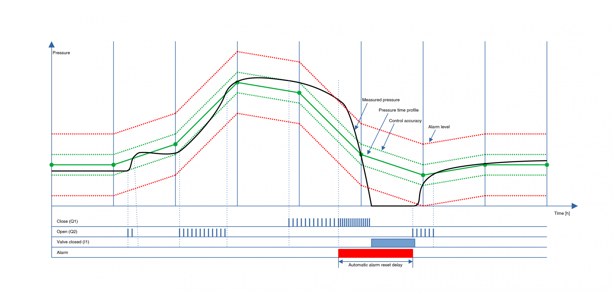 En ambos modos, el dispositivo utiliza tablas de regulación que definen el valor de presión deseado en función del tiempo o del caudal. Entre los valores establecidos, el regulador calcula los puntos intermedios de forma lineal, lo que permite un ajuste suave de la presión.