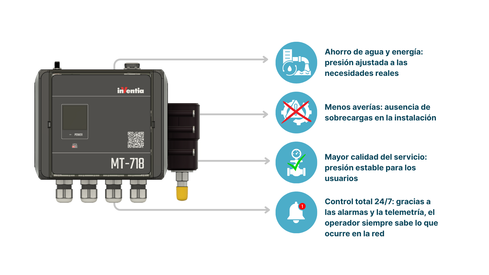 Uno de los dispositivos más avanzados de este tipo es el MT-718, un módulo telemétrico con carcasa IP68 que, gracias a los algoritmos PRV integrados, funciona como un regulador de presión inteligente.