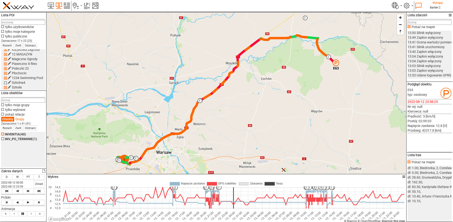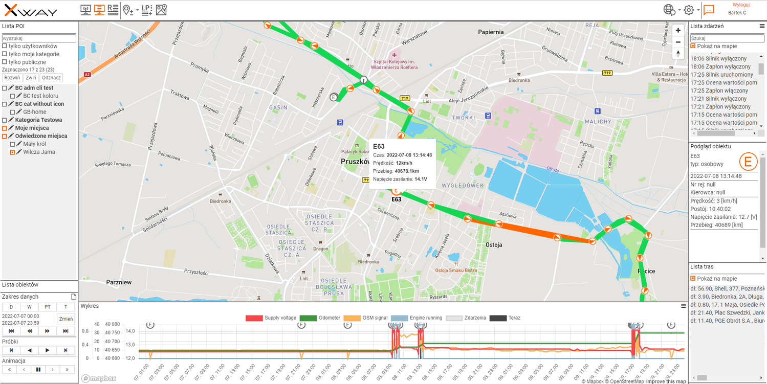 Platforma Xway udostępnia zestaw raportów umożliwiających szczegółową analizę przebiegu transportu. Raporty obejmują m.in.: historię tras i postojów, zestawienia temperatur z wybranego okresu, raporty otwarć drzwi wraz z lokalizacją, listę alarmów i naruszeń przypisanych do konkretnych pojazdów lub przewoźników.