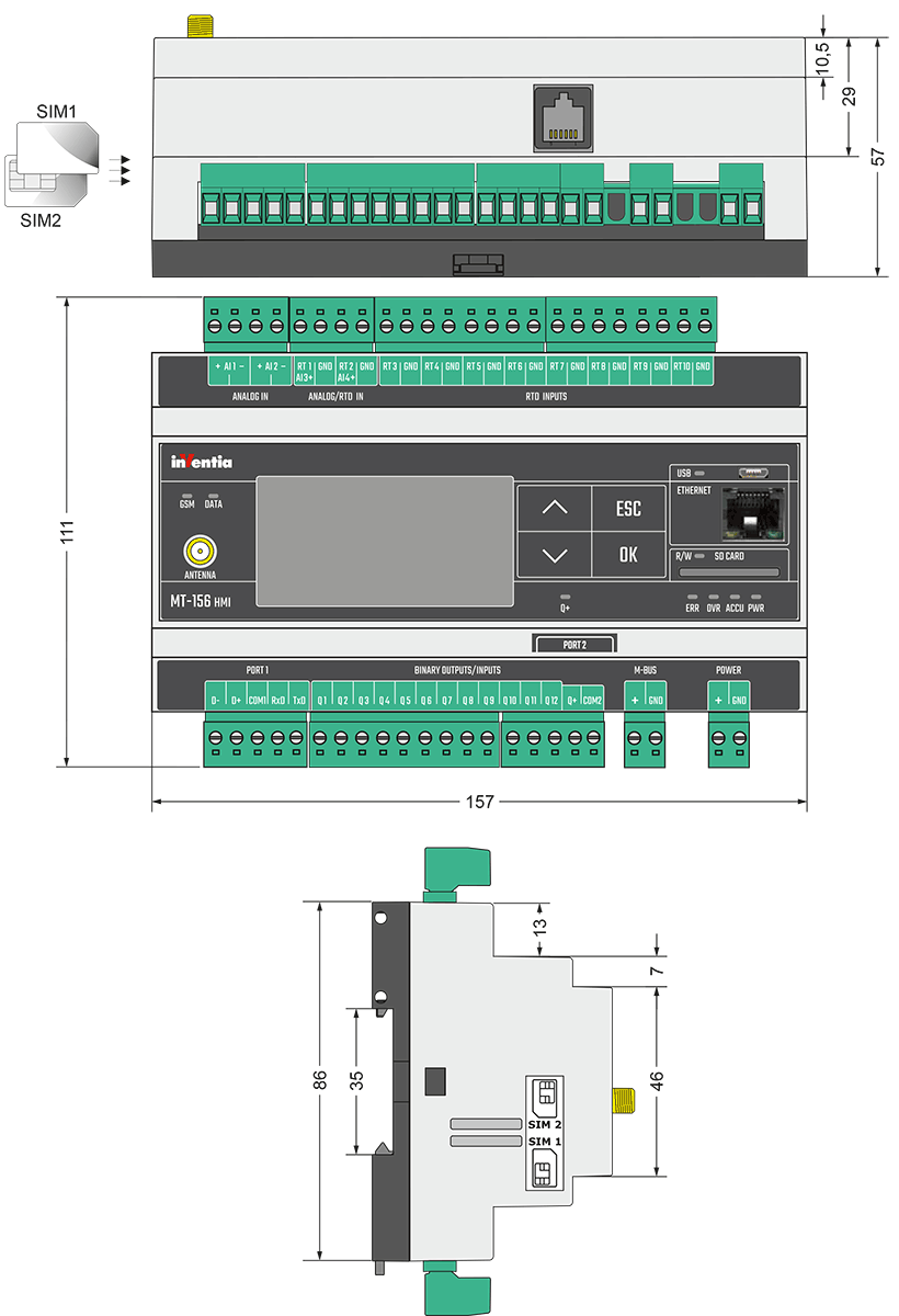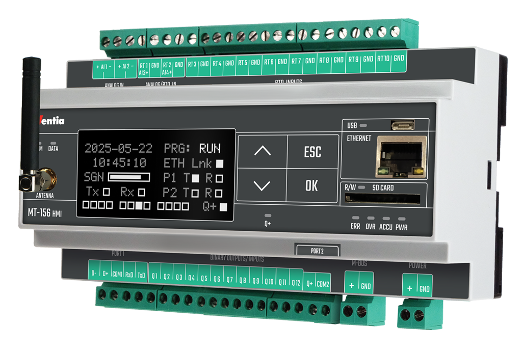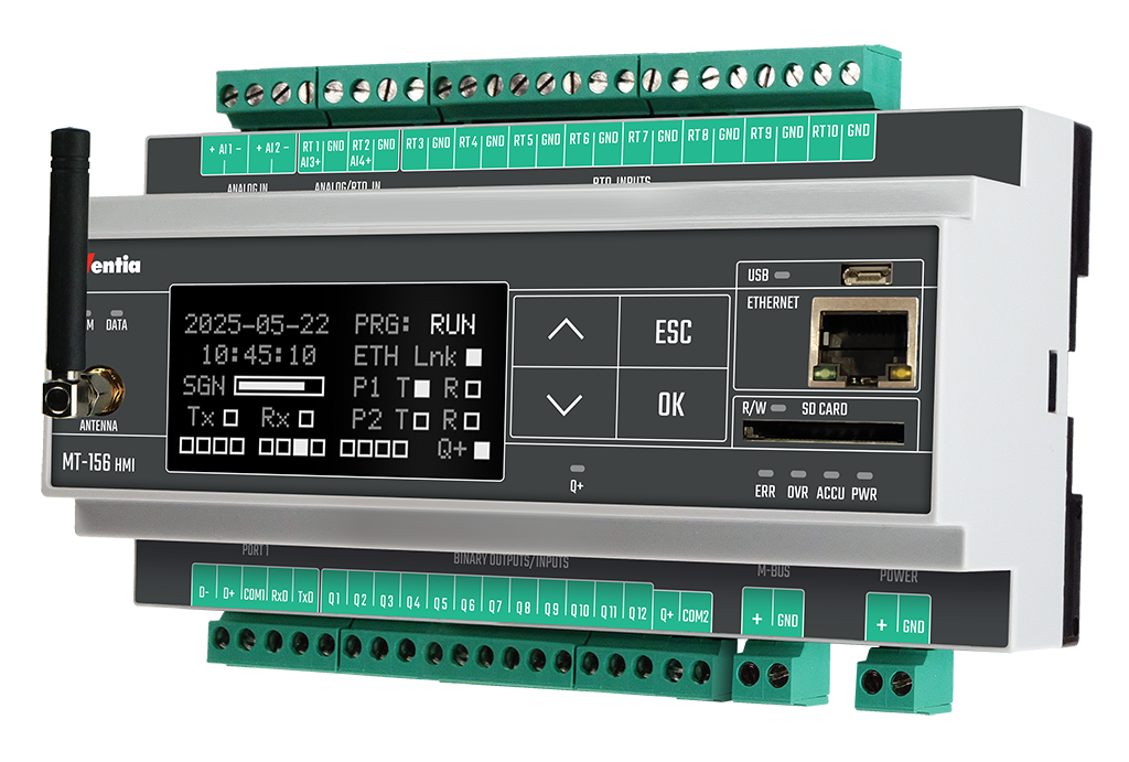 Контроллер предлагает широкий диапазон входов и выходов — 10 входов PT1000 (в том числе 2 настраиваемых как 4–20 мА), 2 аналоговых входа 4–20 мА, 12 настраиваемых бинарных входов/выходов и порты: Ethernet, RS-232/485, USB, M-Bus и 1-Wire. Благодаря расширенным функциям пользовательской логики, сигнализации, регистрации данных и удаленного обновления прошивки, MT-156 HMI HeatSens является комплексным решением для сложных телеметрических и промышленных приложений.